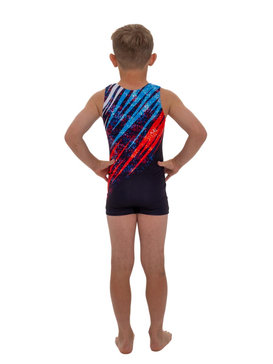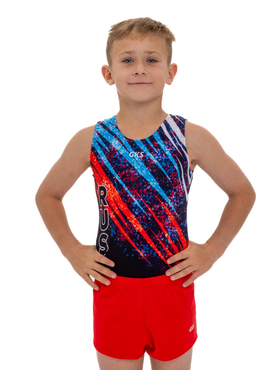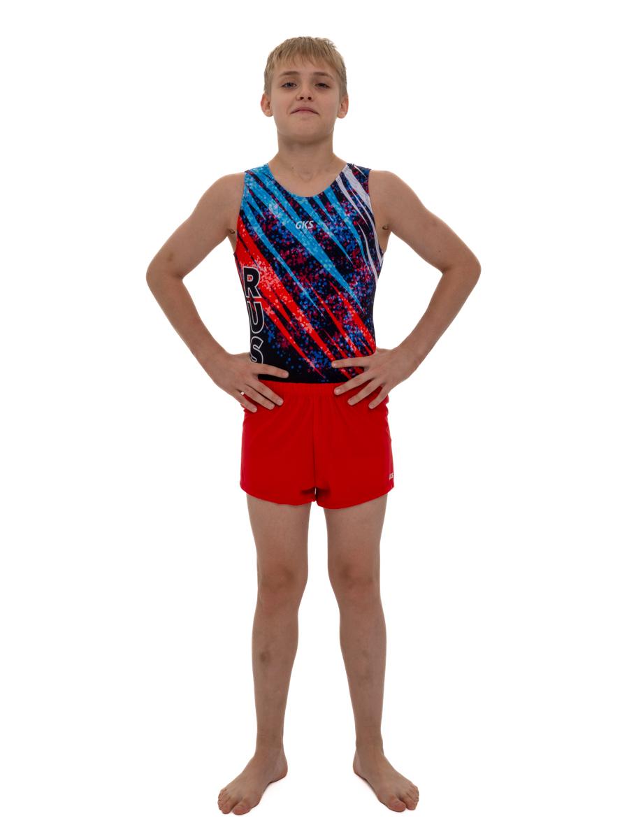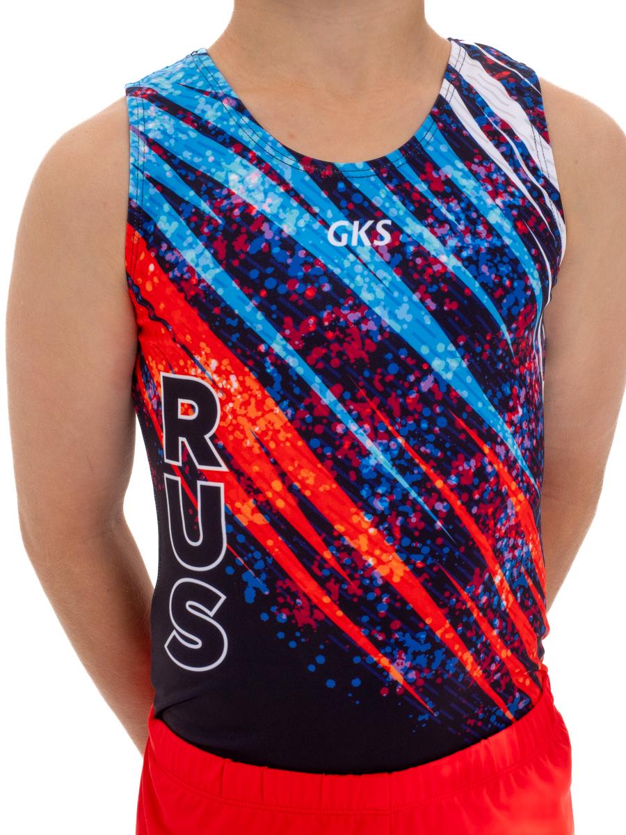 Купальник мужской для спортивной гимнастики GK Sport RUS 201-13 черный с красно-синим рисунком без рукава