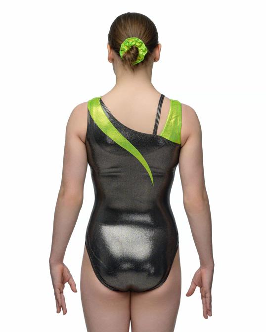 Купальник женский для спортивной гимнастики GK Elite 5472 черный с салатовой вставкой без рукава