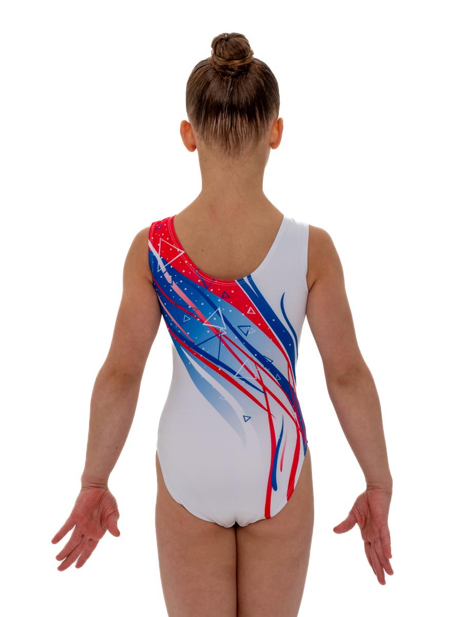 Купальник женский для спортивной гимнастики GK Sport RUS 202-26 белый с красно-синим рисунком без рукава